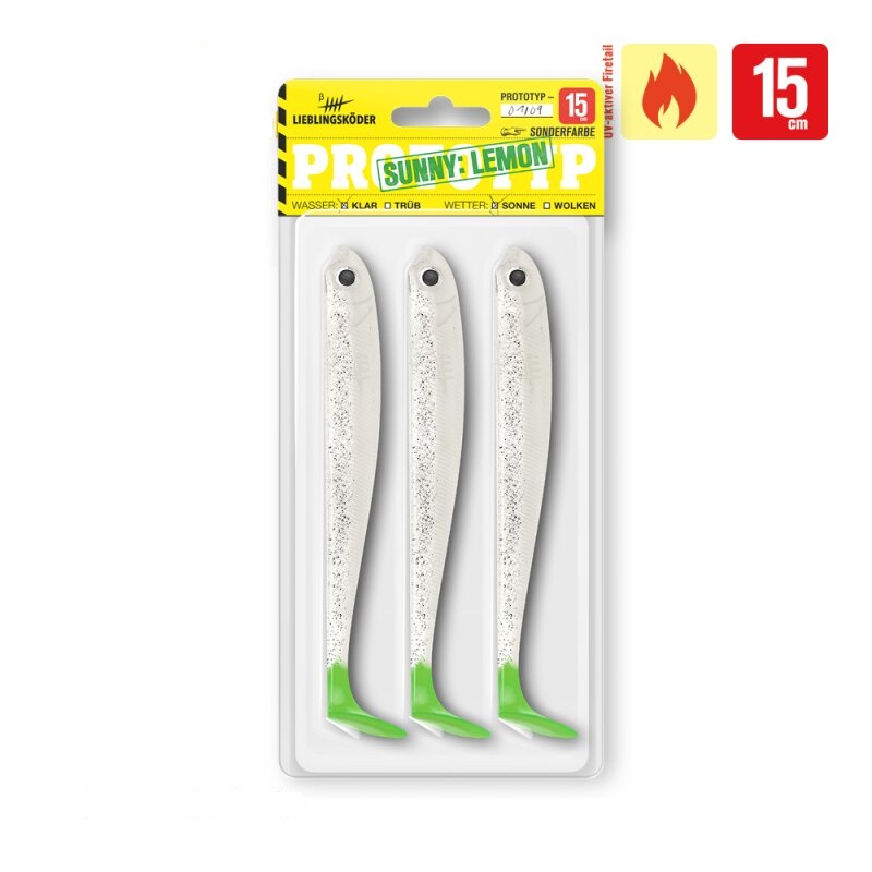 De Sunny Lemon softbait is in zijn basiskleur geïnspireerd op onze klassieke Lieblingsköder-kleuren. De lichte basiskleur en de glinsterende rug maken elke roofvis agressief. De groene, UV-actieve staart vormt met zijn natuurlijke, typisch voor Lieblingsköder zijnde staartactie een extra visueel focuspunt voor roofvissen.