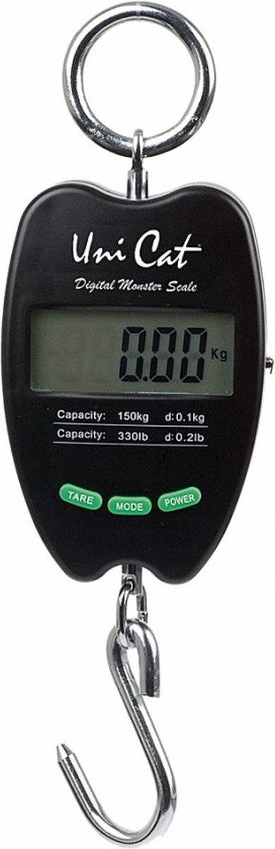 Door de vele vangsten boven de 100 kg hebben wij de Uni Cat Digital Monster Scale in ons programma opgenomen. Het weegbereik ligt tussen 10 g en 150 kg (gemeten in stappen van 10 g). De zeer robuuste behuizing maakt deze weegschaal ideaal voor het meervalvissen, dat soms onder de zwaarste omstandigheden plaatsvindt. Het verlichte display heeft zich eveneens bewezen en biedt uitstekende ondersteuning bij het wegen van nachtelijke vangsten.